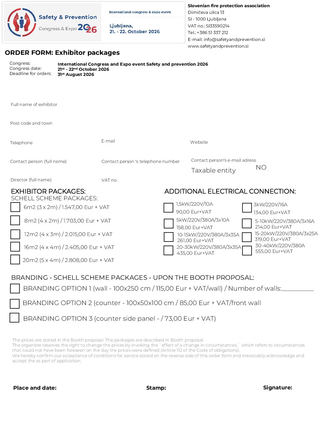 If you would like to exhibit at the international congress and fair event Safety and Prevention, fill out the attached application form and send it to SZPV, i.e. to info@safetyandprevention.si. We will call you to discuss the details.