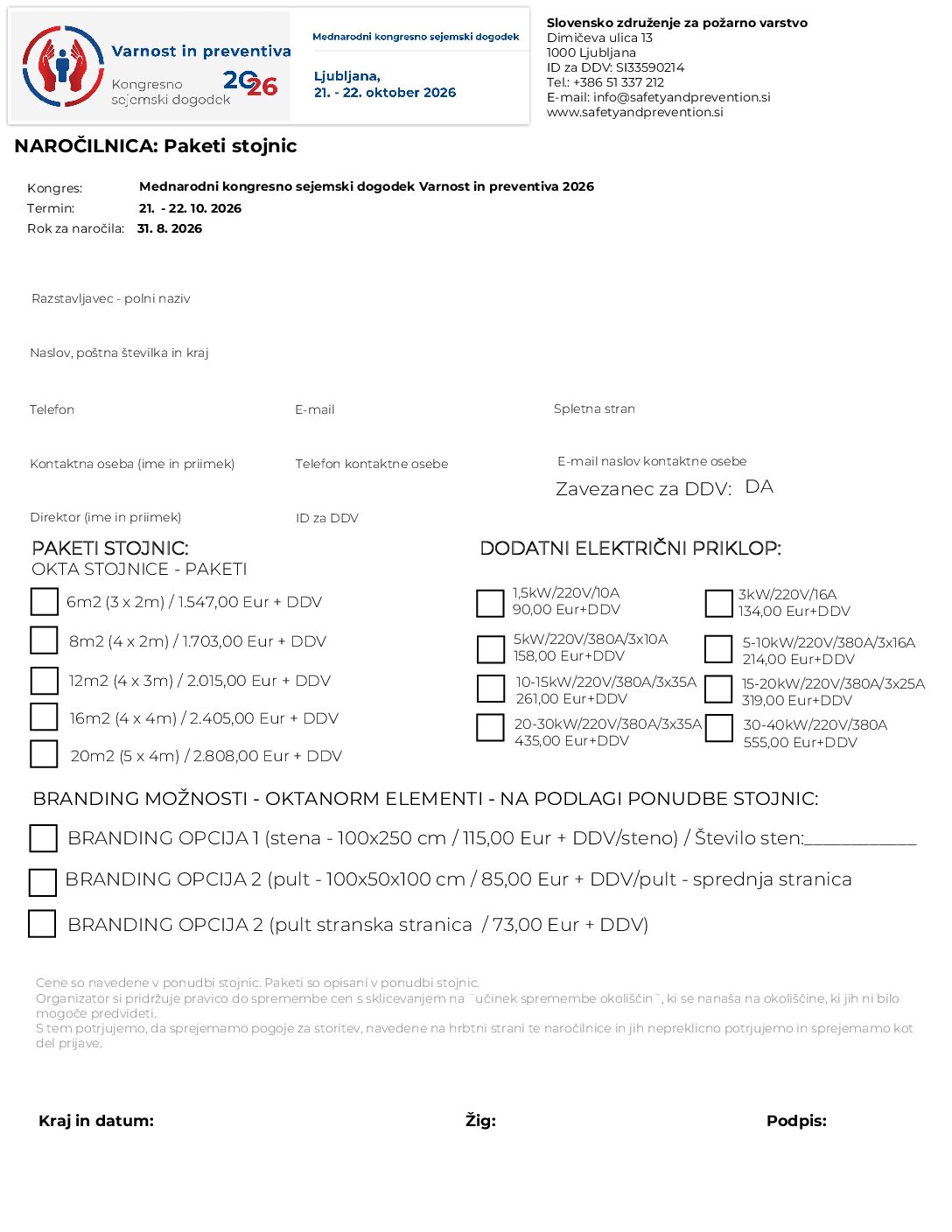 Če bi želeli razstavljati na mednarodni kongresno - sejemski prireditvi Varnost in preventiva, izpolnite priloženo prijavnico in jo pošljite na SZPV, tj. na info@safetyandprevention.si. Poklicali vas bomo, da se dogovorimo o podrobnostih.